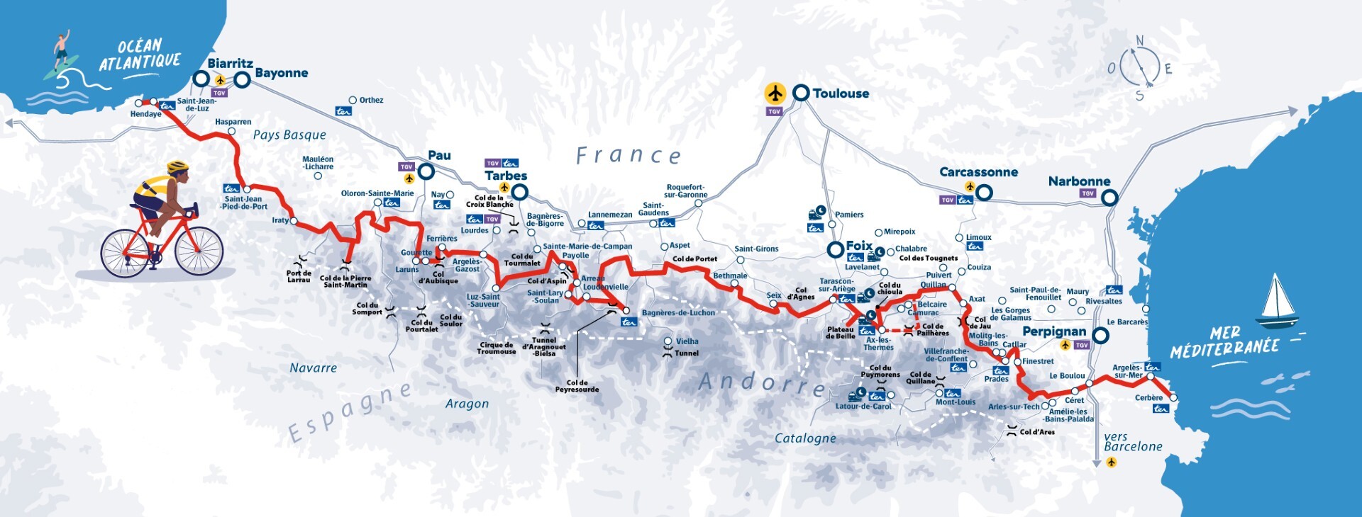 Jugez plutôt ! 910 kilomètres de traversée et 20 000 mètres de dénivelé à gravir entre la mer et l'océan, à la conquête des cols parmi les plus mythiques au monde et de sommets plus secrets, de villages typiques et paysages atypiques, voici le programme de cette traversée panoramique et grandiose qui restera gravée dans vos mémoires à jamais.